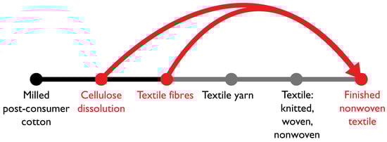Once the production of cellulose regenerated from waste textiles reaches a commercial scale, the fabrication of cellulose-based textiles mostly takes place in separated stages in the textile value chain between raw material, fibre, yarn and textile production [12,22], as it is currently demonstrated at a lab and pilot scale (see Section 2 and Section 3.1). The replacement of cotton with regenerated cellulose in the established textile value chain relies on a supply of high-quality, strong fibres that can be transformed into yarns for knitting and weaving. There is a problem with pursuing this established textile value chain with regenerated cellulose materials obtained from waste textiles. The chemical recycling of cellulose waste explores cotton and paper waste as its cellulose source to provide strong fibres for existing textile fabrication processes [4,19,23,24]. Regenerated fibre, however, has lower strength than cotton fibre [8] and its quality further decreases at each recycling stage [25]. With chemical recycling processes of cotton-based textiles reaching a commercial scale, large quantities of recycled regenerated textiles would generate cellulose materials that would not produce strong enough fibres for woven or knitted textiles [8]. Such ‘low value’ [25] (p. 122) regenerated materials, therefore, require new interventions in the value chain to make use of these waste resources.