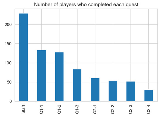 Number of players who completed each quest (Q1-1 to Q2-4) in the game, indicating player retention after each quest.