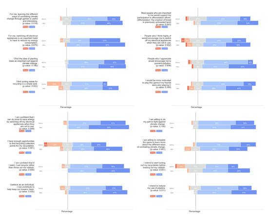 Questions from other categories specific to certain topics saw significant differences as well, such as recycling (“I find sorting waste for recycling is a simple task”: p = 0.002; “I intend to start sorting out my recyclables before tossing out my rubbish”: p = 0.002). These results show that the game possibly helped participants demystify some concepts relating to sustainability, such as the deed of recycling.