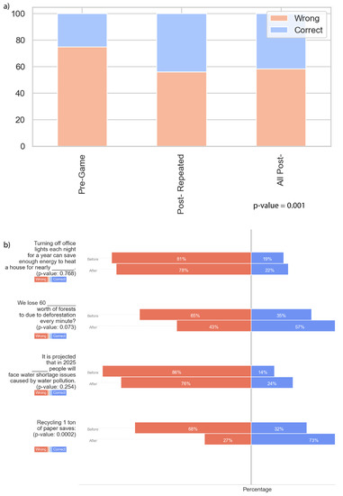 Results from the knowledge questions. (a) Percentage of correct answers and wrong answers for the knowledge questions. From left to right, the questions represented are: the pre-game questions, the questions in the post-game questionnaire repeated from the pre-game questionnaire, and all of the post-game questions. A one-sided two-sample paired t-test where the null hypothesis was that the post-game results were not significantly better than then pre-game results had a p-value of 0.001. (b) Differences in wrong and correct answers for the questions repeated between the pre-game and post-game questionnaires.