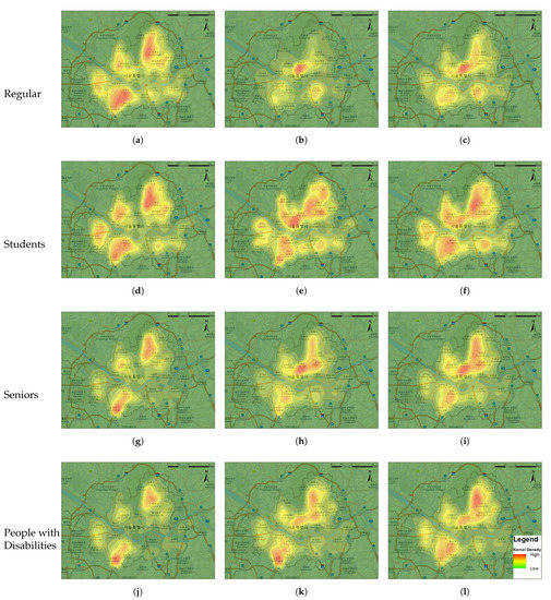 Figure 2 presents the spatial distributions of potential home, work, and other activity locations. Most of the potential home locations are concentrated in the northeast and southwest urban fringe areas (a,d). These two clusters are more preferred by seniors and users with disabilities as their home locations (g,j). However, the work locations for regular users are agglomerated near central city areas of Seoul (b). School locations are basically scattered all over the city (e). Daily routine places for seniors and people with disabilities are clustered near home as well as the central city areas (h,k). The distribution of other activity locations is similar among the four groups, although the purpose of these trips are various. These places are normally located between home and work locations (c,f,i,l).