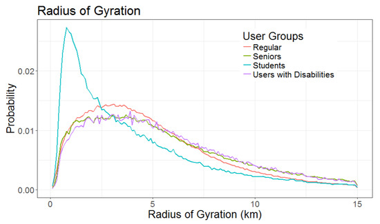 Except for the student group, all three other groups shared a similar distribution for travel time between commuting locations. Students usually traveled closer to home compared to the other groups. The mean of the distribution was smaller, but the standard deviation was higher. This behavior can also be observed from Figure 7. The distribution of the radius of gyration for the student group also stands out in the four groups. It had a smaller mean and a higher standard deviation.