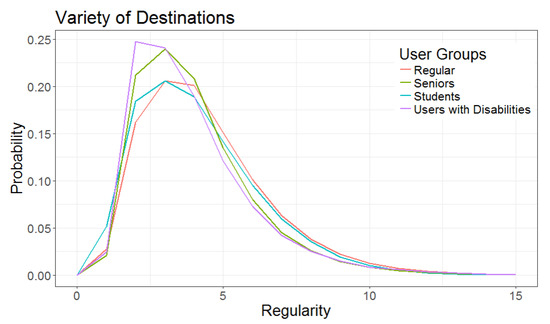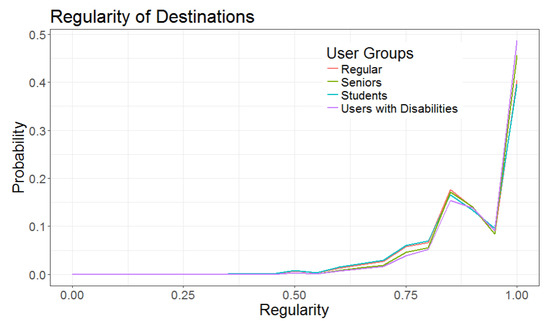 Destination-regularity measures the hourly percentages of the most-visited destinations (Figure 5). The frequency graph shows that most of the travelers have a high repeated pattern of destinations, and most of the regularity is between 0.8 and 1. Their most-visited places are more than 80% of all the destinations they have visited according to their travel history. People with disabilities, seniors, and students have higher destination regularity compared with the regular smart-card users.