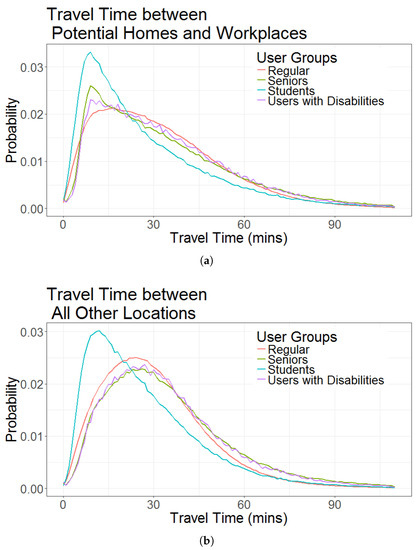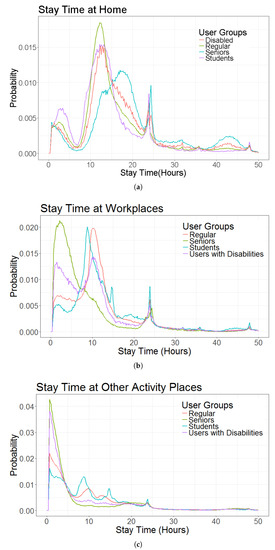Figure 6 shows the temporal mobility patterns of transit riders. As shown in Figure 6a, the distributions of stay time at home for different user groups are usually different. For regular users, students, and people with disabilities, there is a peak around 12 h, indicating a typical stay time at home for these users. Seniors have a longer typical stay time at home. All user groups have peaks at a very short time in their stay time distributions. These 1 to 2 h could represent lunch breaks or the breaks between arriving home in the afternoon and leaving for recreational, social, shopping, or extracurricular activities (for student groups) purposes in the evening.
