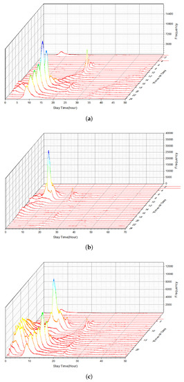 Figure 8 shows that the distribution of stay time varies based on the time of day. Usually, from morning to afternoon, the earlier a user reaches home, the longer the stay time is. This pattern is reversed from afternoon to midnight. From morning to afternoon, the later a user arrives at a workplace, the shorter the stay time is. Users will stay less than 4 h in other activity locations during non-peak hours. This changing pattern by time of day is applicable for all user groups.