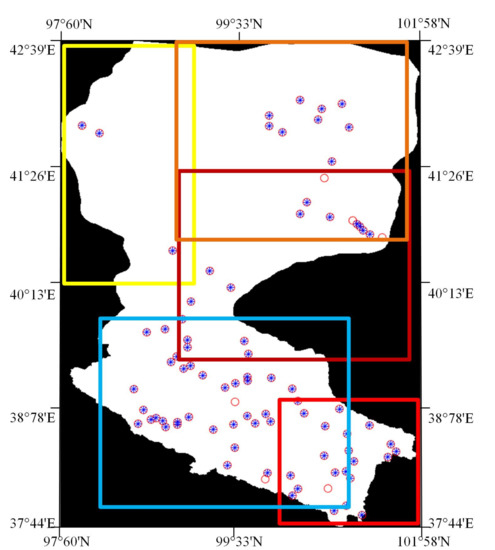 In Figure 1, the white region is Heihe River Basin and the colored rectangles are the five remote sensing images. The brown rings represent the data points of pH and organic carbon (266 samples). The blue stars represent the data points of bulk density (229 samples).