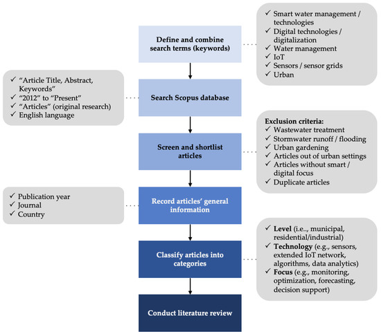 To perform the literature review in smart water management at an urban level, a combinative adaptation of the methodological approaches presented by Aivazidou et al. [35], Lampridi et al. [36], and Banias et al. [37] were followed and graphically presented in Figure 1. In this light, the steps of the proposed systematic methodological framework are illustrated in Figure 1. Initially, several search terms for analysis to retrieve a broader range of results were defined and rationally combined. The Scopus database was explored using the specified keywords and Boolean operators (AND/OR); indicatively, terms such as “smart water technologies” or “digital technologies” were integrated with “water management” in an “urban” context to limit the searches with the relevant research area. In addition, the keywords’ investigation was performed within the “Article Title, Abstract, Keywords” field in Scopus. The timespan was set from “2012” to “Present” to keep track of the most recent innovations of the 4th industrial revolution in the field of urban water management. Finally, only English-written peer-reviewed “Articles” (original research, e.g., case studies, modelling efforts) were considered.