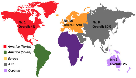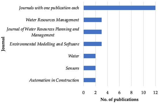 The biennial allocation of the articles over the last ten (10) years is depicted in Figure 2. It is evident that most research articles are accumulated in the last four years, following a rather exponential trend that highlights the accelerating evolution of digitalization. The distribution of the publications by journal is illustrated in Figure 3. It should be noted that the papers are scattered among various journal titles, mainly focusing on environmental and/or water-related issues, without any certain journal monopolizing the topic. The spatial coverage of the articles is graphically illustrated in Figure 4; if the location of the implementation case is not indicated, the country of the article’s first author is used instead. More than half of the publications are performed in Europe, followed by Asian case studies. Notably, none of the collected research efforts has been identified in Africa or South America, highlighting a potentially existing gap between developed and developing countries.