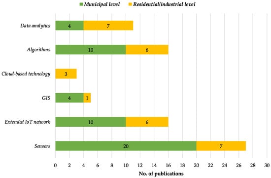 Τhe distribution of the collected articles (27) by type of technologies used and level of analysis is graphically illustrated in Figure 6. Special emphasis is given on the municipal level; in fact, about 74% (20) of the publications refer to the municipal level, while the rest 26% (7) focuses on the residential/industrial one. With respect to the municipal level (green bars), all related publications (20) utilize sensors, validating experimental outcomes that propose sensor grids as an indispensable part of urban smart water systems [61]. It should be noted that half of the papers (10) propose the implementation of an extended IoT architecture. Interestingly, another 50% (10) of the studies develop algorithms, such as machine learning, to support smart water management in urban settings, confirming that machine learning has emerged as a crucial digital technology in engineered water system applications [62]. Only 4 out of 23 articles employ the GIS or perform data analytics (e.g., big data techniques), mainly to foster optimization and forecasting applications. It should be underlined that none of the municipal-level publications utilized cloud-based technologies for data management.