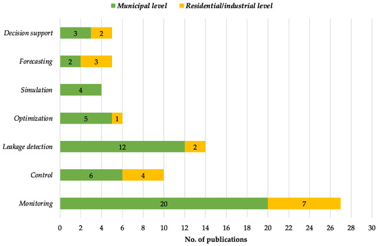 With respect to the research scope/focus (Figure 7), all research articles (27) of both municipal and residential/industrial levels emphasize monitoring applications of water quantity (e.g., consumption, loss) and/or quality (e.g., pollution) through sensors. It has been revealed that monitoring is followed by leakage detections; in fact, although the identification of leaks and cracks could be included in the monitoring case, it is separately reported given the fact that it is mentioned independently in numerous research articles for risk assessment or preventive maintenance purposes [20]. More specifically, 60% (12) of the municipal-level publications refer to leakage detection compared to only 29% (2) of the residential-level ones. Monitoring is usually combined with control processes to check whether monitoring data are in agreement with certain targets; in particular, 30% (6) and 57% (4) of the articles referring to municipal and residential/industrial levels, respectively, perform controlling activities (e.g., through the use of microcontrollers), as they accompany sensor monitoring operations in water systems [63]. It should be noted that, although optimization and simulation processes are conducted in several municipal-level studies (i.e., 25% (5) and 20% (4) papers, respectively), only one paper in the residential/industrial level supports optimization procedures. In contrast, forecasting is mentioned in only 2 out of 20 municipal-level papers and 3 out of 7 residential-level publications, in line with the use of data analytics in this type of study. With respect to decision support systems, 3 municipal-oriented and 2 residential-oriented articles have been identified with the scope of allowing for efficient decision-making, as well as improving the efficiency of urban water systems and reducing costs [29].