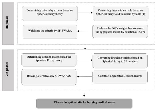 In this section, a novel approach to selecting a suitable location for the disposal of medical waste using MCDM methods in a spherical fuzzy environment is presented. According to the complete explanations of SF-SWARA and SFWASPAS that were presented in the previous section, the proposed approach is presented in two phases. In the first phase, according to the field and geographical situations of the region and former polls and specialist opinions, the selected criteria have been specified by using the SF-SWARA method; the criteria weight were specified by specialists and specialists. In the second phase, according to the outputs of the previous phase, the proposed sites were ranked by the SF-WASPAS method, and among the alternatives, the optimal sites for landfilling of medical waste were identified. The algorithm for solving the problem of locating medical waste landfills is shown in Figure 1.