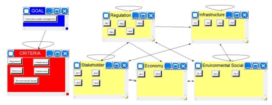 The ANP model between criteria and sub-criteria employed in the study using a second-stage questionnaire is depicted in Figure 1 above. The existence of a line connecting two sub-criteria implies that they are related. Loops contained in each sub-criteria in a criterion describe the relationship between sub-criteria that is within the criteria (inner dependence), while the line connecting between sub-criteria shows the relationship between sub-criteria under different criteria (outer dependence). At this stage, the collection data process using the third stage questionnaire was performed. The questionnaire aims to find out the comparison of pairs between criteria and sub-criteria by experts in the calculations of weighted in ANP based on the results of the second stage questionnaire. After obtaining the priority of sub-criteria in the e-waste management supply chain, selecting sub-criteria was carried out in the next stage, namely, the establishment of priority factors for the e-waste management supply chain from the ANP results. The selection of factors was based on sub-criteria using a Pareto diagram [37], where 20% gives 80% effect for the overall e-waste supply chain management activities in DLH Jakarta. The selection with Pareto aims to see a significant risk effect to provide an effect of 80% for e-waste supply chain management activities.