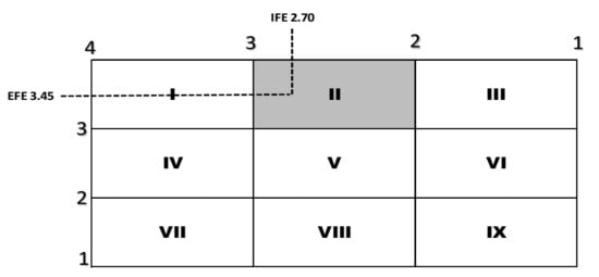 - Zulkarnain, A.; Wahyuningtias, D.; Putranto, T.S. Analysis of IFE, EFE and QSPM matrix on business development strategy. IOP Conf. Ser. Earth Environ. Sci. 2018, 126, 12062. [Google Scholar] [CrossRef]