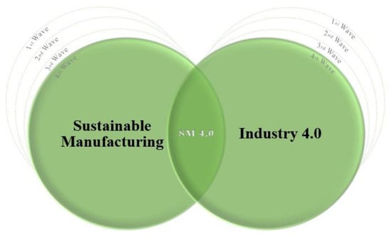 Due to these requirements and the expected benefits of I4.0, a number of scientific communities are becoming involved in investigating the applicability of implementing I4.0 technologies in addressing challenges and issues related to the TPL of sustainable manufacturing. It is evident that the integration of I4.0 technologies and principles to assess and develop SM can contribute to maximizing the economic, environmental, and societal values of I4.0 [6,18,19]. Yet, numerous stakeholders, including industrial policy and decision makers, remain oblivious of such endeavors and their integration. While research efforts have been contributed to the literature, which is analyzed and discussed in this article, there are opportunities for state-of-the-art research. As a new path of inquiry, it is believed there is a need for integrating and systematizing significant research efforts in order to have a better understanding of the topics of interest and also to expand collaboration networks. As one of the preliminary inquiries, this study is aimed at presenting an overview of the broad field of research on the convergence of contemporary waves under the umbrella of “sustainable manufacturing (SM) 4.0”, which has yet to be developed (Figure 1). It includes the dissemination of original findings on pathways and practices of I4.0 applied to the development of SM, contributing a bibliometric structure of the literature on the contemporary waves to reveal how I4.0 could be used to shift the manufacturing sector to a more sustainable-based state. Contrary to the research that regarded sustainable manufacturing as an enabler for I4.0 [5], this study seeks to constitute SM 4.0 as a concept considering I4.0 technologies as expected enablers for the sake of developing SM.