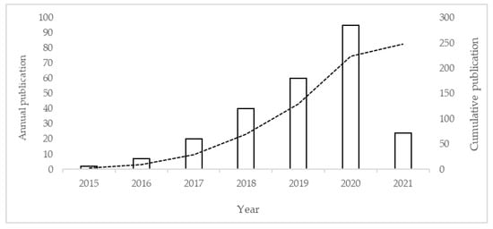 As shown in Figure 2, the first documents came out in 2015 with only one publication, i.e., Kolberg and Zühlke [7], discovering that the understudied topic is very young and has just started to develop. The highest number of annual publications was recorded in 2020 with 95 documents, 1.6 times higher than the previous year. Similar trends can be seen in 2016, 2017, 2018, and 2019, where their annual publications increased by 7, 20, 40, and 60 documents, respectively, revealing that the cumulative number of publications has dramatically soared in recent years.