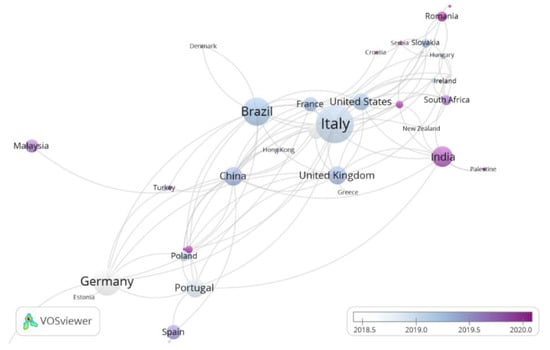 Even though Italy had the most documents and international collaboration (total of 37 documents with 17 countries), Germany and Brazil have the greatest number of citations, i.e., 1785 and 846, respectively (Figure 3). This implies the documents published by leading countries received more attention and citations, e.g., Germany—where the I4.0 concept was born—has the earlier average publication year (2018.15) compared to Italy (2019.05) and Brazil (2019.26), as depicted in Figure 4. This figure presents the co-authorship network map of countries publishing scientific articles in the understudied area as well as shows the dynamic trend in time changing over the years. From the full map, it is revealed that only 73% (43 countries) were connected to others; in other words, they are countries that publish collaboratively. Estonia, Israel, Greece, Germany, and Mexico were accordingly ranked as the top five early countries investigating the subject in various institutions.