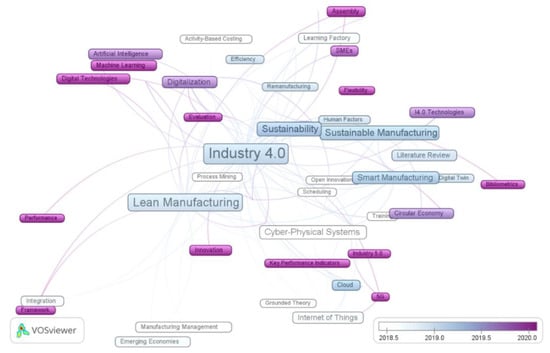 Going through the map shows the development of keywords which was initiated in 2015.5 (average publication year) on the CPS keyword. The purple in the color box displays the recent hotspot keywords. It was observed that Industry 4.0 (2019.1) has significantly directed towards two major keywords, including ‘sustainable manufacturing’ (2019.2) and ‘lean manufacturing’ (2019.0). This implies that this understudied field is likely to remain relevant in the coming years. Moreover, there is a futuristic view on the subject as researchers have begun to discuss the transition of manufacturing sectors under I4.0 for the sake of Industry 5.0 [40,41].