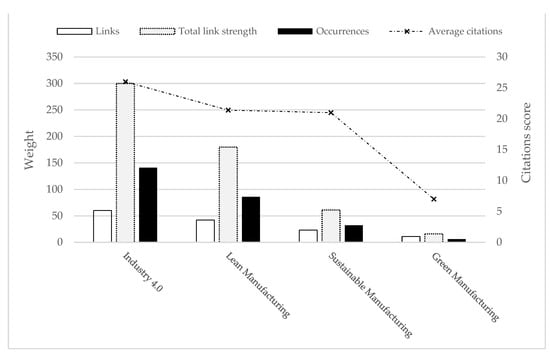 The analyses showed that ‘Industry 4.0’ was the most frequently encountered keyword with 141 occurrences and 300 total link strengths, as illustrated in Figure 6. We also came across the utilization of major keywords—‘sustainable manufacturing’ (32 occurrences, 61 total link strengths), ‘green manufacturing’ (6, 16), and ‘lean manufacturing’ (86, 180). The results of the analysis of the major keywords revealed that ‘Industry 4.0’, ‘Lean manufacturing’, and ‘Sustainable manufacturing’ were the most linked keywords in total. Noticeably, there were three link strengths exceeding 20, which have been made between ‘I4.0 and Lean manufacturing with link strength of 67’, ‘I4.0 and Sustainable manufacturing with link strength of 23’, and ‘I4.0 and Cyber-Physical Systems with link strength of 22’. In addition, I4.0 was co-occurred with technological keywords: ‘Internet of Things (15 occurrences, 49 total link strengths)’, ‘Big Data Analytics (9, 18)’, ‘Autonomous Robots (8, 25)’, ‘Optimization (7, 22)’, ‘Simulation (7, 26)’, ‘Additive Manufacturing (5, 10)’, ‘Cloud (4, 17)’, and ‘Industrial Internet of Things (3, 11)’.