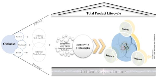 All the mentioned investigations are beneficial when seeking to realize the importance and capability of I4.0 to shift the manufacturing industry to a more sustainable-based state. It is believed the integration of I4.0 technologies to SM assessment, development, and/or management can help maximize the economic, environmental, and societal values of I4.0. According to Enyoghasi et al. [18], this integration would contribute to addressing the requirements relating to SM development, as mentioned earlier (Section 1). However, it is also revealed that such a synergy depends on critical success factors—see Jabbour et al. [10]. To clarify this, a visual representation is manifested in Figure 7, where I4.0 technologies together with other critical success factors are depicted to enable the development of processes, products, and systems based on the 6Rs-based approach to fulfill the TBL requirements of SM. Therefore, new technologies together with other critical success factors and mental models on which the manufacturing encompasses interrelated elements, with interconnected processes, units, norms, values, behaviors, individuals, and groups, which are influencing and being influenced by one another, are requested to sustainable manufacturing development so as to sustainably address challenges and issues related to eco-system destruction and numerous other unsustainable paradigms. There were many significant efforts as such; however, the development is generally traced by compartmentalizing the manufacturing’s integral elements—products, processes, and systems. This is due to sustainable manufacturing is a complex systems problem [15] and which is being relied highly on the analytical approaches that make learning and development through reductionist thinking and mechanism interpretation.
