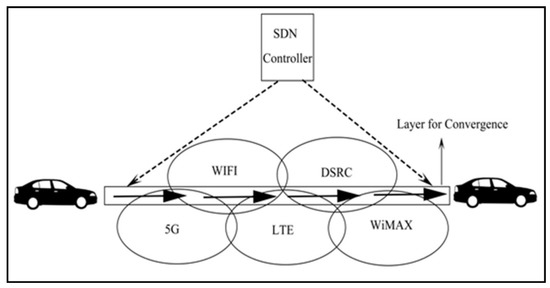 Xu et al. [8] offered a comparison study between the DSRC and LTE standards, which was evaluated with various communication scenarios, and the authors concluded that DSRC is superior to LTE in collision avoidance and safety applications. The integrated DSRC and LTE systems, according to the author, can help provide safe communication over a greater distance. Kumar et al. [9] proposed an efficient integrated DSRC WiMAX system based on common physical layer parameters to create communication for the intelligent transportation system. Kumar et al. [10] established an uplink communication simulation model based on several vehicular communication scenarios, such as sending data from WiMAX to DSRC using FFT subcarrier matching. Kandar et al. [11] presented a physical layer OFDM parameter, which was simulated by mixing DSRC and WiMAX and tested with image samples to demonstrate that successful communication between multiple standards can be established. Kumar et al. [12] investigated the performance of several vehicular communication situations by considering payload calculation and resource allocation. It can be evaluated in terms of how the resource is assigned to the vehicle’s users via sub-channelization. Kumar et al. [1] presented a novel approach to converge DSRC and WiMAX by considering common physical layer parameters and testing them using picture transmission between DSRC and WiMAX. Thun et al. [13] developed an OpenFlow SDN controller-controlled vehicle ad hoc network augmentation technique. Khadim et al. [14] developed an optimal energy-efficient system for vehicle networks, which they evaluated using a multicast routing protocol controlled by SDN and fog computing. In a vehicle network, Kalokhe et al. [15] suggested a durable and efficient routing technique and a secure channel using software-defined networks.