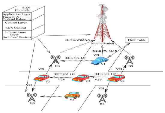 The application layer, control layer, and infrastructure layer are all controlled by the SDN controller. Each layer performs its own set of tasks. The top application layer aids load balancing by filtering unauthorized car users through the firewall. The control layer is responsible for general control of the OpenFlow SDN, whereas the infrastructure layer contains switches and devices that connect vehicles and base stations. The flow table is used to keep track of many communication data, such as the distance between neighboring vehicles and the base station, as well as the direction and speed. Vehicle V1 can use the data in the flow table to seek a nearby network by examining the scenario. Vehicles can support two forms of communication: DSRC to DSRC with the use of a base station (BS) and DSRC to mobile networks hybrid communication (3G, LTE, WiMAX). Mobile networks, on the other hand, offer a wide choice of communication options but do not support significant mobility [28,29].