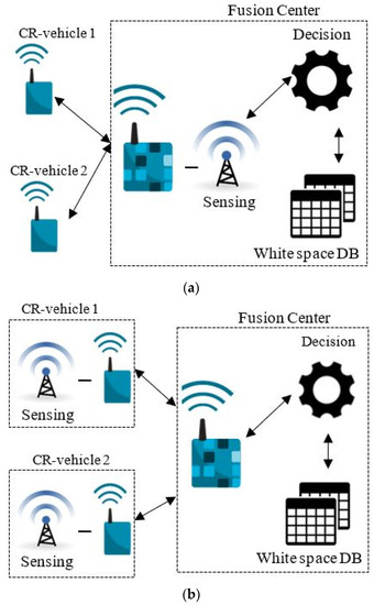 (a) Centralized decision and sensing, (b) centralized decision–co-operative sensing.