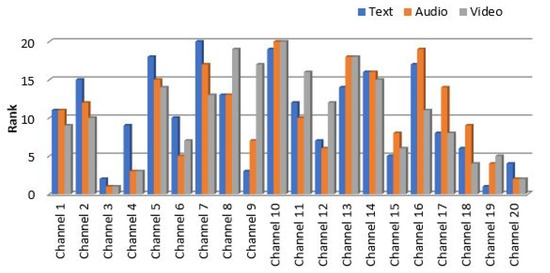 DAHP–TOPSIS channel comparison for text, audio, and video (20 channels).