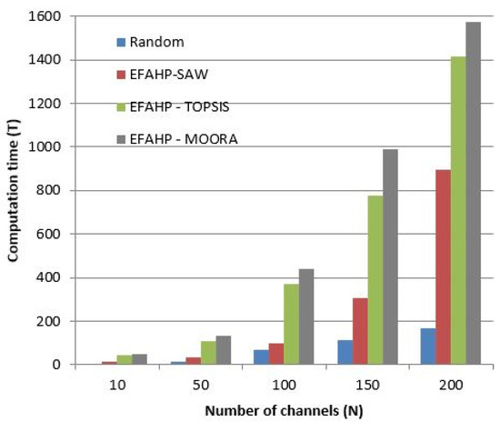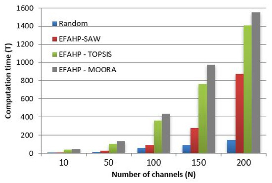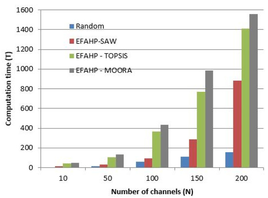 The proposed DAHP–TOPSIS methodology provides a better result by comparing other channel selection techniques, such as DAHP–SAW and random DAHP–MOORA. SAW and MOORA also can be integrated with DAHP to take channel decisions. SAW and MOORA are lightweight techniques to handle a smaller number of alternatives. Computation time and delay are much lower in the proposed techniques by comparing them with techniques and the comparative qualitative metrics mentioned in Table 20. The results of Table 20 are visualized in plots in terms of best, worst, and average cases, as shown in Figure 5, Figure 6, Figure 7 and Figure 8.