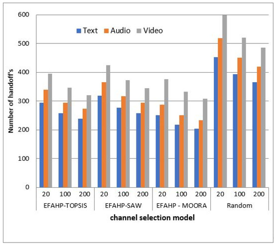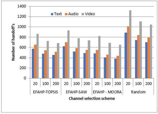 The operational cost for handoffs is much costlier compared with other operations, especially in CR-VANET. By considering 20, 100, and 200 channels used to analyze the various spectra utilized in CR_VANET handoffs, comparative analysis of DAHP–TOPSIS, DAHP–MOORA, DAHP–SAW, and random helps to identify the best quality of service provided by CR-VANET in terms of average end-to-end delay, packet delivery ratio, packet loss ratio, and control overhead. Figure 9 and Figure 10 depict the comparison of various channel selection respective handoff schemes for PU low traffic = 0.2 and PU high traffic = 0.6. Table 21 depicts the various handoff strategies by varying types of data, channel size, and traffic in PU, i.e., low = 0.2, high = 0.6.