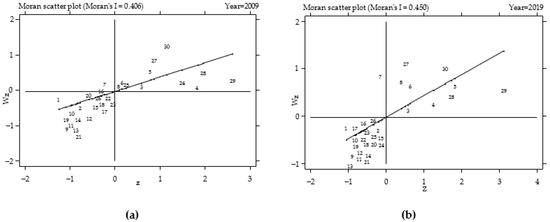As shown in Table 5, the energy intensity in the 30 regions in China was positive. At the 1% level, the significance test shows that energy intensity had a positive spatial correlation among provinces. The scatter plots of energy intensity in 2009 and 2019 are plotted in Figure 1 to vividly show the spatial correlation of energy intensity.