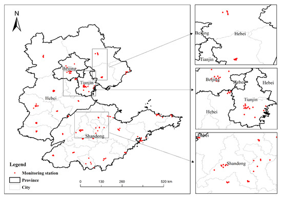 Locations of air quality monitoring points of the Beijing–Tianjin–Hebei–Shandong region in 2018.