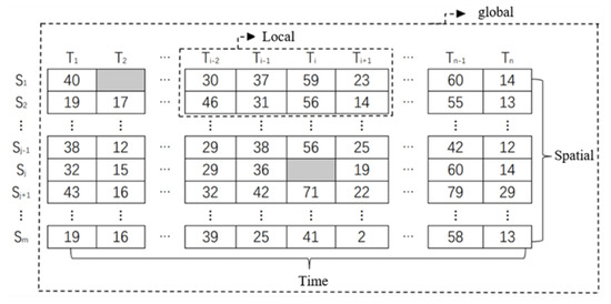 For the interpolation of missing point V, consider using the numerical interpolation of different adjacent monitoring points at the same time point, such as S–S, which is called spatial view in this paper. Consider using numerical interpolation at different time points of the same monitoring point, such as T–T, which is called time view in this paper. Secondly, the local and global views can be obtained for different adjacent ranges of adjacent monitoring points and different lengths of adjacent time periods: for some continuous time points, the values of some adjacent monitoring points are used for interpolation, which is called local view in this paper; if the values of all monitoring points and time points are used for interpolation, it is called global view.