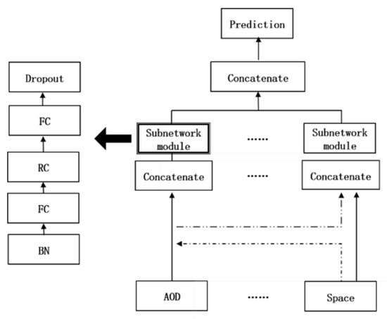 Early studies used the unary linear regression model between AOD and PM [7,8,9,10]. However, due to the impacts of changes in meteorological conditions, by introducing meteorological features, the multiple linear regression model can more accurately represent the relationship between AOD and PM [11,12,13,14]. Taking into account the spatial heterogeneity of the AOD–PM relationship, geographic weighting models and spatiotemporal geographic weighting models are used to estimate PM concentrations [5,15,16,17,18,19]. This type of model uses local regression methods to predict PM concentrations instead of global constant regression parameters. With the deepening of research, the AOD–PM relationship has gradually been regarded as a multivariate and non-linear relationship [20,21]. Therefore, many nonlinear statistical models are used to estimate PM concentration, including support vector regression [22], the random forest model [22], the generalized additive model [23,24,25], artificial neural networks, and deep learning methods [22,26,27,28,29]. Studies have shown that deep neural networks perform best, and the model’s structure can best reflect the complex relationships in the atmospheric environment system. Moreover, with the improvements in information processing efficiency, more features—such as meteorology, land use, NDVI, and population density features—are being included in such models [11,12,13,14,15,16,17,18,19]. Although deep neural networks have inherent advantages in overcoming the disaster of dimensionality through data and information mining, the auto-correlations of input features (such as the lag effect), inter-feature correlations, partial correlations, and interaction have been ignored in the existing research. The functions presented in [30,31] during feature input do not distinguish between primary and secondary features, and cannot fully capture the information contained in the data. Therefore, it is necessary to establish a multi-module neural network that can capture these features separately.