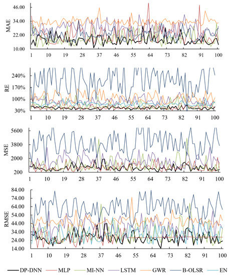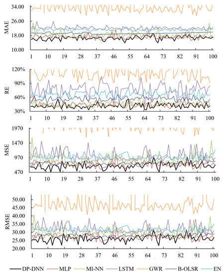The B-olsr model finds it difficult to deal with a sparse matrix with many discrete characteristics. Although the prediction stability was good in the random monitoring point experiment, the error fluctuates greatly in the time prediction test; EN could effectively deal with the expansion of dimension through penalty term, but the prediction accuracy was poor. The generalization ability of GWR was lower than that of neural network model, and the error fluctuation in regional migration prediction increased significantly. From the perspective of GWR calculation speed, the calculation process for large-scale samples is cumbersome, and it takes a long time to find the optimal bandwidth and model fitting. From the error results of many experiments, the LSTM model has strong stability, but compared with DP-DNN, the error is large and the model takes too long. Although MI-NN and MLP models are slightly ahead of DP-DNN in speed, the accuracies of MAE, RE, MSE, and RMSE are lower than that of DP-DNN. From the chart, DP-DNN also has good stability and short-term prediction ability. At the same time, it also proves that the DP-DNN model can indeed capture more data information through multi-module structure.