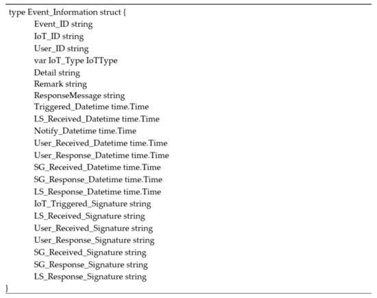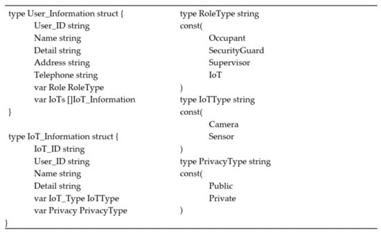 All participants that want to be a part of the system need to register with BC’s certificate authority (CA). CA generates the public key and private key pair and sends it to the participant. Figure 2 and Figure 3 show the chaincode’s data structures and types of information of a user, IoT, and event information. Note that the “chaincode” is a “smart contract” that is defined in Hyperledger Fabric. It is almost the same function as the “smart contract” we mentioned before, which can execute the code in the blockchain.
