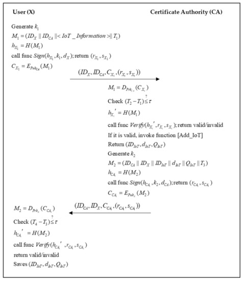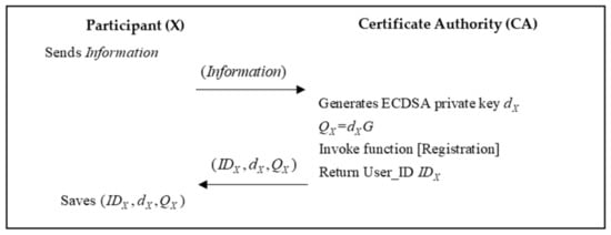 Figure 4 shows the process of the registration phase between the new participant (X) and the blockchain center’s certificate authority (CA). The steps are described as follows: