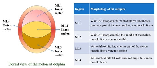 In this study, we initially identified four morphologies (ML1-ML4) of Grampus griseus (Risso’s dolphin, a species of toothed whales) melon (Figure 1). The selected melon regions displayed patterns of muscle fiber and fat distributions throughout the melon. The aim of the study is to identify gene expression of different morphologies of the melon of toothed whales. Appropriately, we applied transcriptomic technologies to gain molecular perception into the melon morphology of toothed whales. The outer melon region (ML4) contained more differentially expressed genes compared to the inner melon regions. The expressed genes were involved in muscle function, fat metabolism, and morphogenesis.