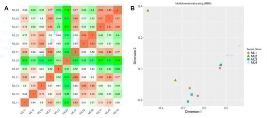 Preprocessing of data and sample distances. (A): Correlation matrix using top 75% genes. (B): Multidimensional scaling plot representing sample distance. Each sample with replicates, ML1 (ML11, ML12, ML13), ML2 (ML21, ML22, ML23), ML3 (ML31, ML32, ML33), and ML4 (ML41, ML42, ML43).