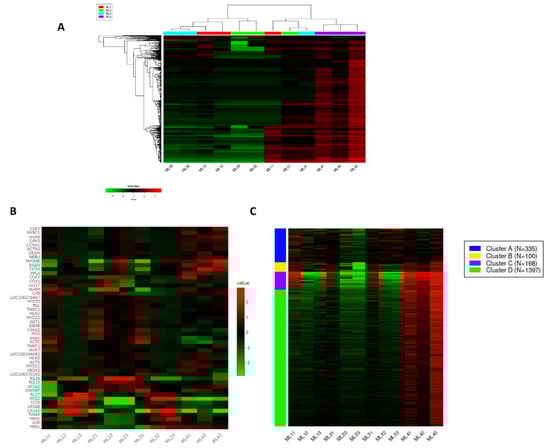 Gene distribution and clustering in different samples. The red color indicates high gene expression, and the green color indicates low gene expression. (A): Hierarchical clustering of most variable 1000 genes among the samples. (B): Interactive map of most variable 50 genes in the samples. (C): k-Means clustering of most variable 2000 genes into four groups.