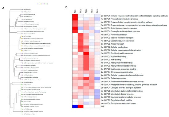 Functional enrichment analysis concerning highly expressed genes. (A): Enriched pathways for each cluster of k-Means. Gene sets closer on the tree share more genes. Sizes of dot correspond to adjusted p-values. (B): Pathway analysis of PCA rotation.