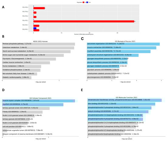 Distribution of DEGs in different parts of melon and their functional enrichments. (A): Identifying DEGs by DESeq2 method. (B): Enriched KEGG pathways for ML4 up—ML1 down. (C): Enriched Gene Ontology (GO) biological processes for ML4 up—ML1 down. (D): Enriched GO cellular components ML4 up—ML1 down. (E): Enriched GO molecular functions for ML4 up—ML1 down. Blue bars indicate significant enrichment at p-value (< 0.05).