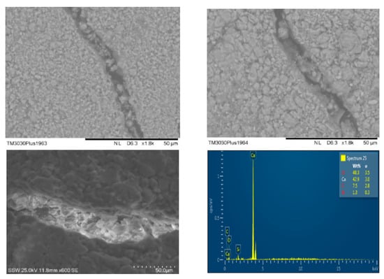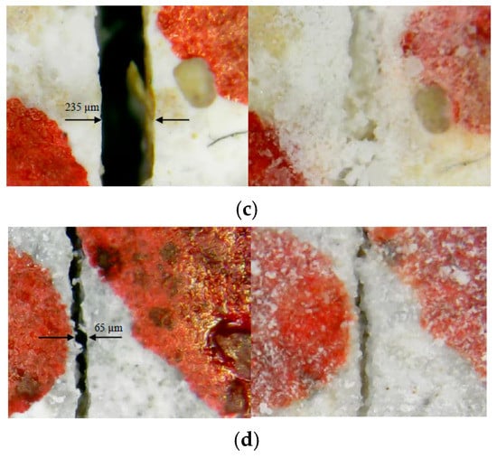 - Surface cracks of up to around 65 ± 10 µm, 220 ± 10 µm, and 275 ± 15 µm in width exhibited self-healing for specimens exposed to an environment with a combined change in T and RH, cyclic wetting and drying, and water submersion, respectively.