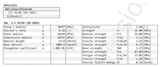 Fragment of the report from Sofistik software showing material parameters entered into the model [own source].