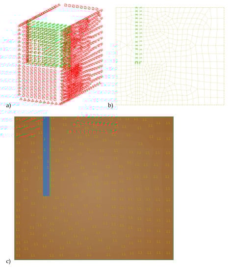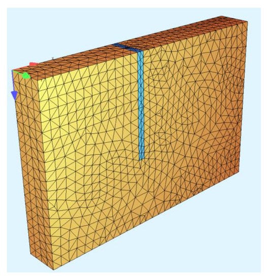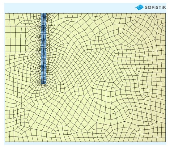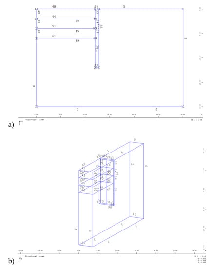 After defining the materials, it is possible to enter the geometry of the model [27]. Model building consists of defining structural points, then structural lines connecting the entered points, and then surfaces that are connected by the introduced lines. The introduced points together with the structural lines form the foundations of the geometric model (see Figure 3). Figure 3 shows 2D and 3D views of the geometric model of the discussed solution as created in the Sofistik software. The next step is to generate the solid elements of the model (see Figure 4). Figure 4 shows correlation between structural elements and materials of the model. Due to the nature of the analysis, the same type of finite elements cannot be used for soil solids and diaphragm walls. Finite elements should be generated in such a way that their density is greater in places of stress concentration, while avoiding an excessive quantity of them, specifically within the soil-reinforced concrete interaction (interface), as this considerably extends the numerical calculations. It is necessary to wisely agree on the scope and size of finite elements, because an increased number does not necessarily translate into greater quality of results.