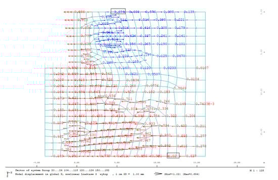 The authors made a comparative model in Plaxis―a trusted environment used in everyday geotechnical analysis—in order to verify the modeling results. Plaxis is undoubtedly one of the best and most well-developed tools for the analysis of the interaction of the structure with the soil. Sofistik has enormous potential and can be used for extensive analysis of different structures, such as bridges and tunnels, for example. Therefore, in the Plaxis 2D CE V20 software, an analogic model was developed using the same material parameters, phases and boundary conditions, with the results then compared to those generated by Sofistik.