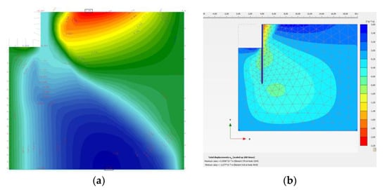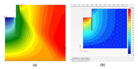 Comparison of models—horizontal displacements for phase III, 4.0 m deep excavation: (a) Sofistik; (b) Plaxis [own source].