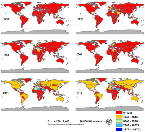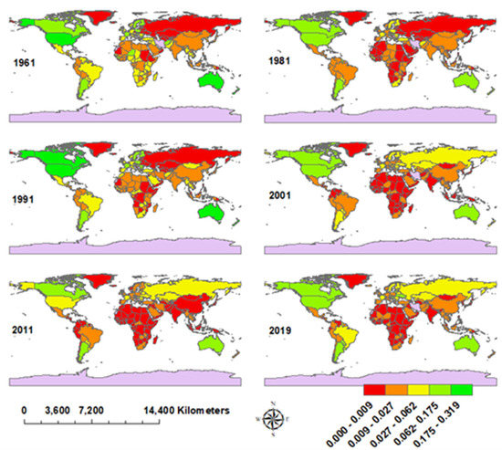 Generally, although agricultural production technology and output are improving, the population is also increasing. In particular, we are increasingly dependent on international trade, which makes us appear insufficient in terms of food security when encountering extreme events. According to the above analysis of factors affecting food security and equation (1), the comprehensive pattern map of the global food system vulnerability was generated. The results of this study are consistent with the results of the Economist Intelligence Unit’s (Global Food Security Index 2019) [25]. Shown as Figure 9, the vulnerability (food insecurity) index of the food system in Africa and South Asia gradually increased from 1961 to 2019, especially in Sudan, Botswana, Algeria, etc. Over the same period, the vulnerability of the global food security system in South America, northern Europe and East Asia is gradually decreasing, including Argentina, Finland, Sweden, China, etc. Additionally, the highest food security level was in the United States, Canada and Australia. From 1961 to 1991, the vulnerability of the food system in the former Soviet Union was decreasing until the dissolution of the former Soviet Union. After the dissolution of the former Soviet Union, the security level of Russian Federation’s food system has been gradually improving.