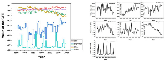 Figure 2 shows that the net food import per capita in Oceania and North America are negative, while the net food imports per capita in Africa and Asia are positive. The per capita net import value of grain in Europe and South America has changed from positive to negative since 1990, indicating that their per capita food self-sufficiency has gradually improved and their per capita net food imports have gradually decreased. The per capita food access increased in North and West Europe from 1961 to 1990. In Southern Europe, the food access per capita from 1990 to 2019 was increasingly dependent on imports, which was mainly reflected in the increasing net food import. From 1961 to 2019, From 1961 to 2019, the overall change of per capita food access in Central Asia, South Asia, and Southeast Asia were relatively stable, mainly showing that the per capita net import remains stable and at a low level for a long time (Supplementary Materials Figure S11). However, the per capita food access in West Asia was mainly affected by the increase in food imports. the per capita grain import in Central Asia has been negative since 1990. In the Americas, the per capita food self-sufficiency of North America is sufficient, and the per capita net food import is negative, while the per capita net food import of Central America and the Caribbean is positive, and the per capita net food import of South America has been negative since 1990, indicating that the per capita food self-sufficiency of South America has gradually improved in the last 30 years. In Oceania, the per capita food self-sufficiency is sufficient, so the per capita net food import is negative, exporting a lot of food to other countries (Supplementary Materials Figure S11). The per capita food availability in Africa depended on food imports during 1961–2019. The net per capita food import in North Africa enhanced from 0.057 to 0.164, which put the food system in jeopardy. The net import per capita of South Africa has changed from negative to positive since 1990 and showed a significant increasing trend.