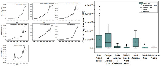 Total reserves (e.g., gold and US dollars) allow purchasing of emergency food when an extreme food crisis occurs in a certain area (total reserves can be converted into food purchasing power to make up for the lack of local food production). Cash savings in all countries have shown an upward trend, which has accelerated significantly since 2000. The cash savings in each of the study regions showed an upward trend from 1961 to 2019 (Figure 3). After 2000, the cash savings in all the regions grew significantly due to the rapid economic development in the 21st century. As can be seen in Figure 3, the cash savings were higher in East Asia and the Pacific, followed by Europe and Central Asia, Latin America and the Caribbean, South Asia, North America, and Central Asia, Middle East, North Africa, and sub-Saharan Africa in the last 20 years. The imbalance of regional development is mainly because of their different cash savings. In fact, promoting the balanced development of global regions is of vital importance to maintaining the stability and security of the global food system.
