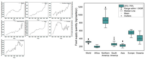 As shown in Figure 5, the global food supply per capita shows some distinct variations in different periods. It showed a rapid increase over 1961–1980 and 2000–2019. From 1980 to 2000, the global food supply per capita showed a slow decline. After 2000, the food supply per capita in Oceania showed a fluctuating downward trend. Figure 5 shows that the annual per capita food supply in North America, Europe, and Oceania (Africa, South America, and Asia) was higher (lower) than the global mean. From 1978 to 2019, the total grain supply of the United States, China, India, and Brazil ranked first in the world. However, in 2019, North America had the highest food supply of 1177 kg/capita, followed by Europe and Oceania with a food supply of 559 kg and 517 kg/capita, respectively. Although the total grain supply in Asia ranked at the top of the grain supply quantity, its annual food supply was only 335 kg/capita, which is approximately one-third of that of developed countries in North America. In 2019, the per capita food supply in Africa was 245 kg, which was smaller than the global average of 398.9 kg (Figure 5). By increasing the per capita food supply in Asia, Africa, and other regions, the imbalance of global food supply will be mitigated, and global hunger will be diminished.